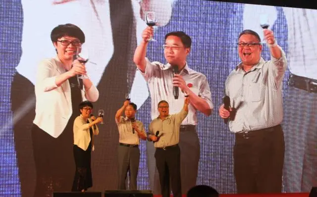 ▲浙江省市新生代企业家联谊会会长鲁伟鼎、吴淑英和香港青年代表顾伟诚共同致祝酒词