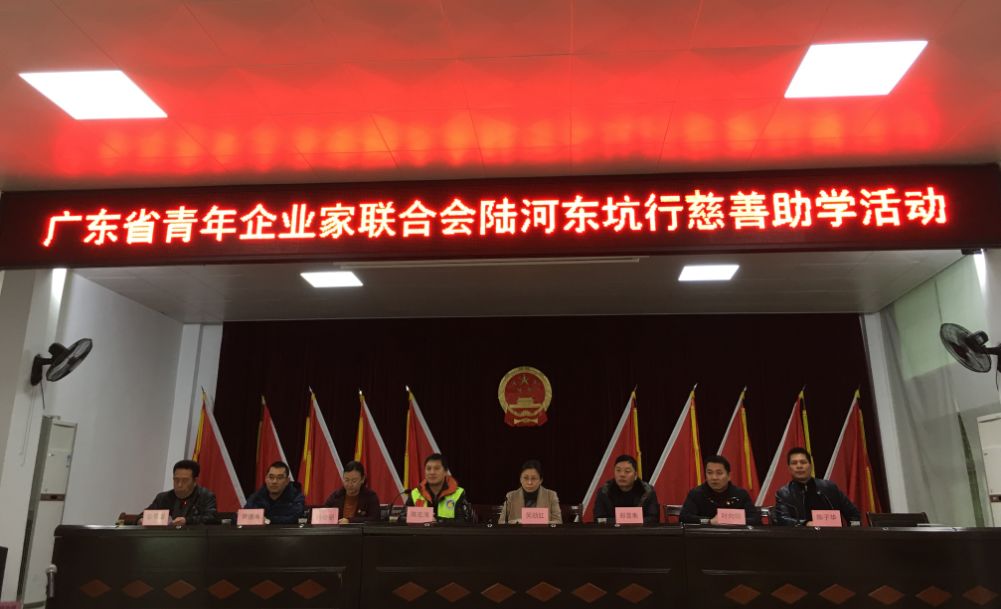 广东省青年企业家代表和省工商联、陆河县、东坑镇领导共同为贫困学生发放助学金。