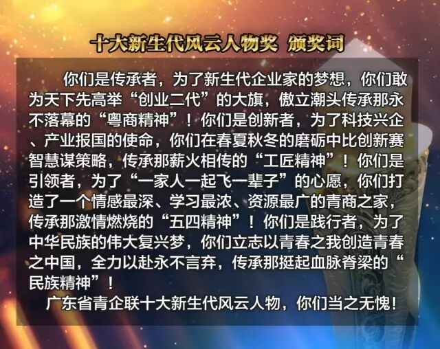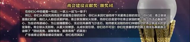 当晚,在广东省青联微电影《传承》的震撼首播中,揭开了广东省青年企业家联合会成立五周年庆典晚宴的序幕。广东省青企联成立于2012年5月17日,五年来,在广东省委统战部、省工商联的关怀指导下,广东省青企联本着“创新传承和赢未来”的精神和“服务青商、凝聚青商、发展青商、成就青商”的宗旨,以情感建设、学习建设、资源建设、公益事业四大平台为核心。积极开展非公有制经济后备人才队伍建设,坚持理想信念教育,不断团结和引领全省各地青年企业家组织和团体共同成长和发展,在坚持履行责任中不断引导广大青年企业家把自身的发展融入社会发展大潮,成为广东最具影响力、最有特色的优秀青年商会,成为最具活力、最具凝聚力的新生代粤商大家庭。