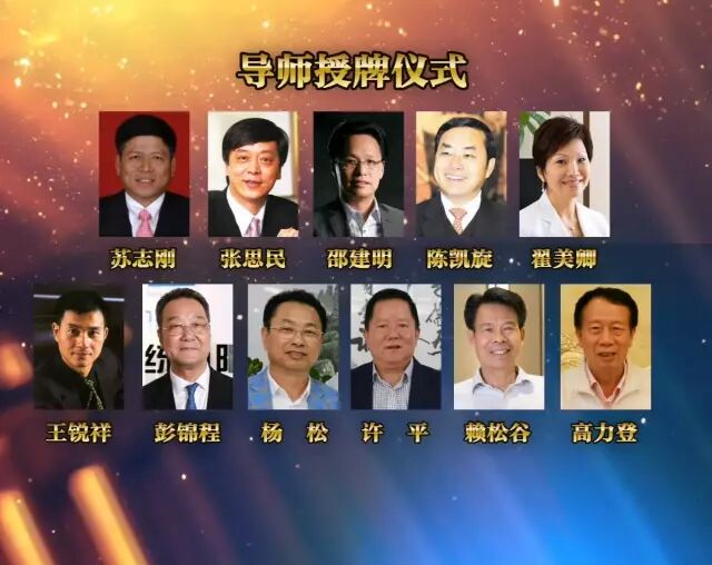 特邀长隆集团董事长苏志刚、集团董事长翟美卿、海王集团董事长张思民、海印集团董事长邵建明、立白集团董事长陈凯旋、锐丰科技董事长王锐祥、广胜达建设集团董事长杨松、强力集团董事长许平、成星自动化系统董事长彭锦程、东升实业董事长赖松谷、高登铝业董事长高力登共11位广东杰出企业家担任广东省青企联导师。