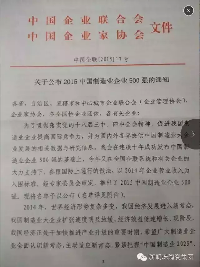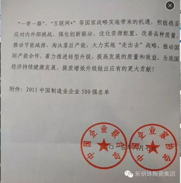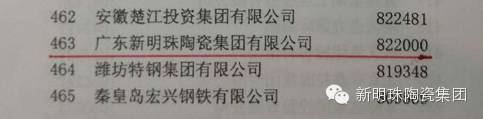 8月22日,中国企业联合会、中国企业家协会举办的“2015中国500强企业高峰论坛”在广西南宁举行,会议当天发布了2015中国制造业企业500强名单,广东省青年企业家联合会会长单位新明珠上榜2015中国制造业企业500强,名位第463位,也是陶瓷行业仅此一家上榜的企业。