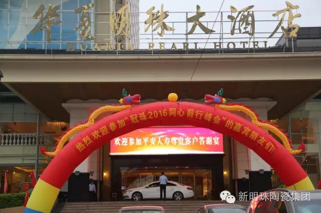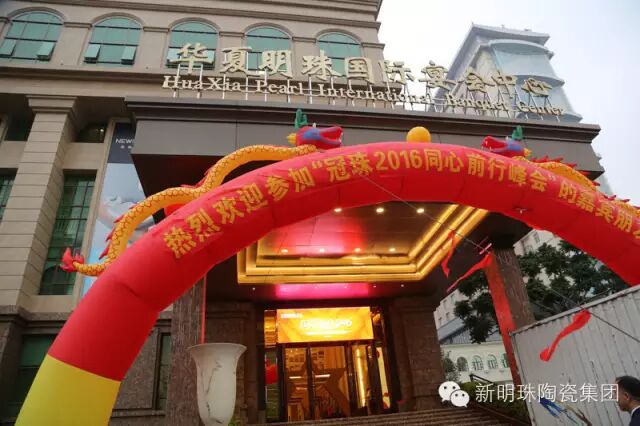 位于南庄华夏陶瓷博览城的新明珠集团和冠珠总部大楼、华夏明珠大酒店等地方早已呈现出一派浓浓的喜庆氛围。特别是总部大楼外,更是拱门矗立、条幅高悬、彩旗飘飘。