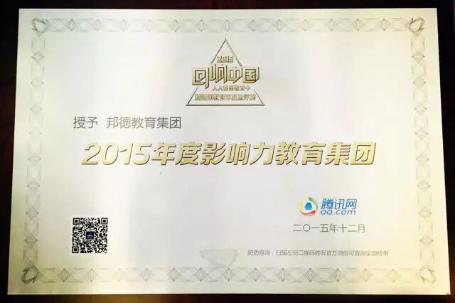 经数百万网友的票选,用户、专家及投资人组成的专业测评团队的测评,邦德教育最终荣获回响中国“2015年度影响力教育集团”。