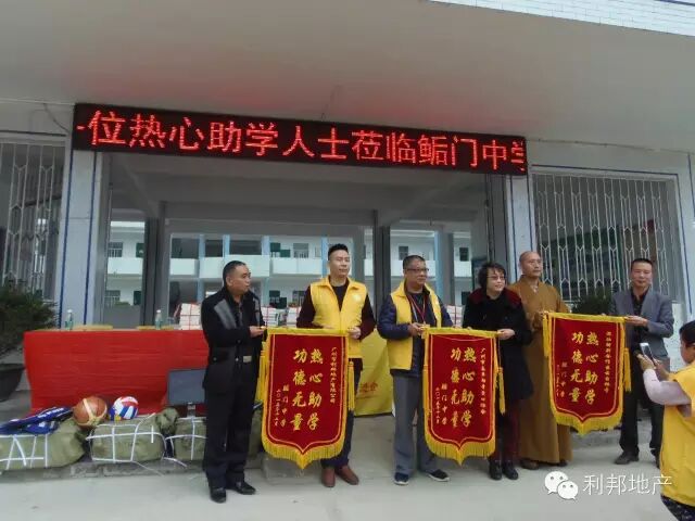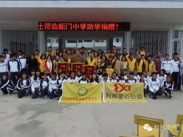 利邦地产会同广州市春草助学促进会、海丰县云台禅寺、社会各界爱心人士及公司全体员工、连同广东广播电视台公共频道《全民帮帮忙》栏目组、汕尾市电视台和报纸记者以及社会各界爱心人士一行,带着精心准备的学校所需运动器材、电脑、课外读物、善款来到鲘门中学。