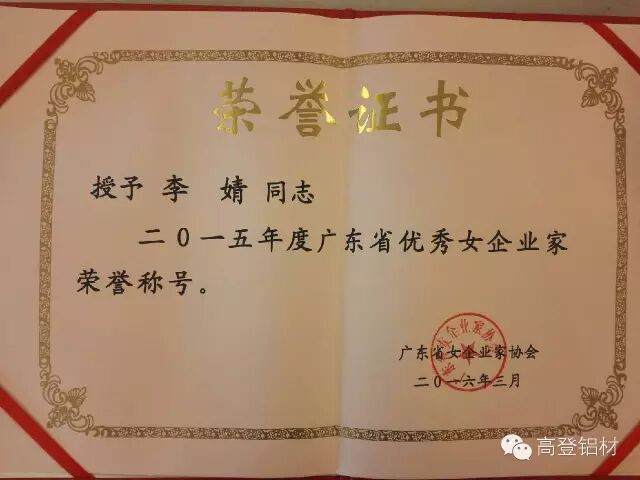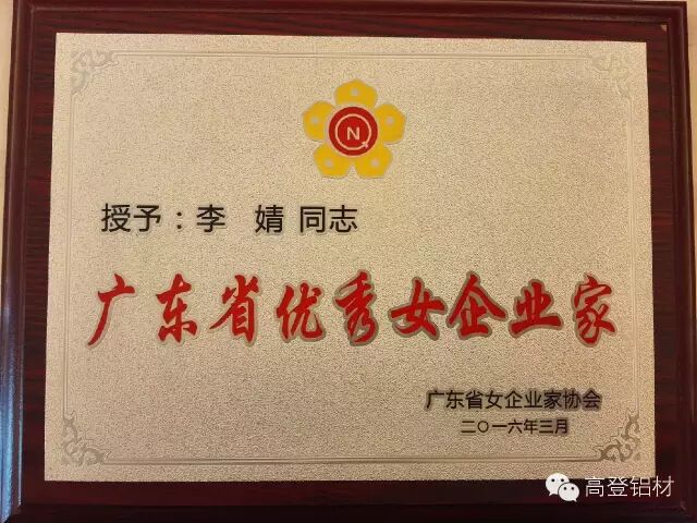 除了经营企业以外,作为87后的中国铝业创二代的榜样李总还获得很多荣誉称号,市政协委员、2013年肇庆市优秀女企业家、2014年和2015年肇庆市优秀女企业家、2014年亚洲品牌十大杰出女性、2015年“肇庆市十大优秀企业家”、2015年广东省优秀女企业家等。在高总李总的带领下,公司近年来获得了很多荣誉,如:中国驰名商标,国家高新技术企业、广东省制造业五百强企业、广东省制造业优秀企业、中国节能产品、2014-2015年度中国房地产500强开发商首选品牌、广东省地产标杆企业、中国铝材十大品牌、亚洲品牌五百强、全国家居行业十佳供应商、广东省铝门窗企业优秀供应商;中国工业铝型材二十强企业等;